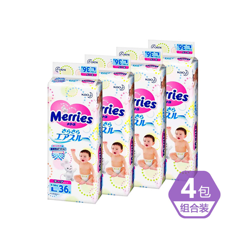 【4包装 原装箱】花王(Merries)三倍透气纸尿裤L36片适合9-14公斤